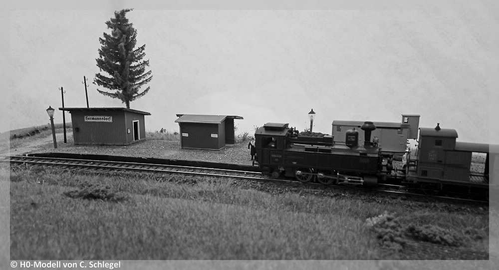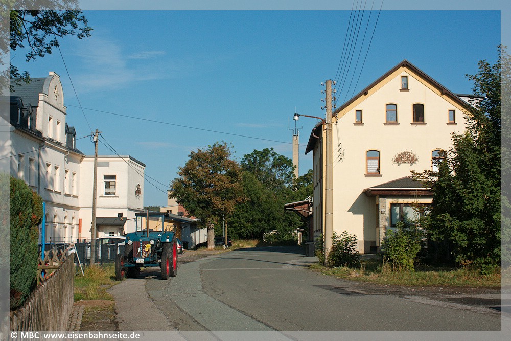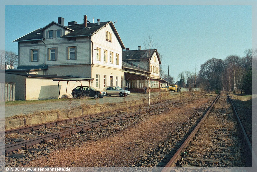 [44] Von dieser Station blieb in natura nichts übrig, deshalb soll erneut ein Schlegel-Modell zur Veranschaulichung herhalten: Eine sächsische V T der dritten Bauform rollt mit dem Zug von Schlettau in den Hp ein, der an Hochbauten eine Wartehalle, einen Freiabtritt und einen Wagenkasten vorweist. Ein interessantes Detail ist die Gasbeleuchtung: Die Gemeinde musste sich gegenüber der Staatsbahn verpflichten, das Anzünden und Auslöschen der Laternen selbst zu finanzieren. Dies währte lediglich die ersten 13 Monate des Bahnbetriebs.
