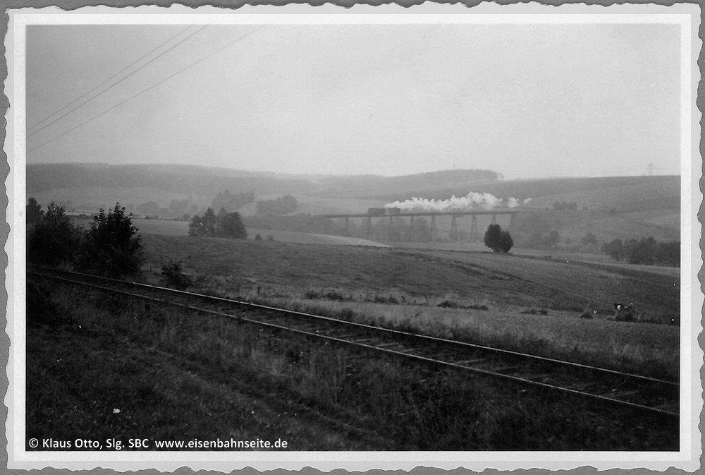 [38] Diese herrliche Szene zeigt 86 741, die am 24. September 1966 mit einem Pwgs 88 nach Elterlein unterwegs ist, um die letzten beiden Güterwagen abzuholen. Der Standpunkt des Fotografen ist unweit des Einfahrsignals nahe der Zwönitzer Straße.[39] Auf dem Ostwiderlager haben einige Eisenbahnrelikte die Zeiten überdauert. Auf den Schwellen ruht der Entgleisungsschutz und links gar ein Stück Schiene mit Auszugsvorrichtung, Blick nach Westen/Zwönitz. Im Inneren des Widerlagers befindet sich ein Hohlraum aus Gründen der Materialersparnis. Rechts befindet sich seit rund einem Vierteljahrhundert die Straßenbrücke der Elterleiner Ortsumgehung (S 258).