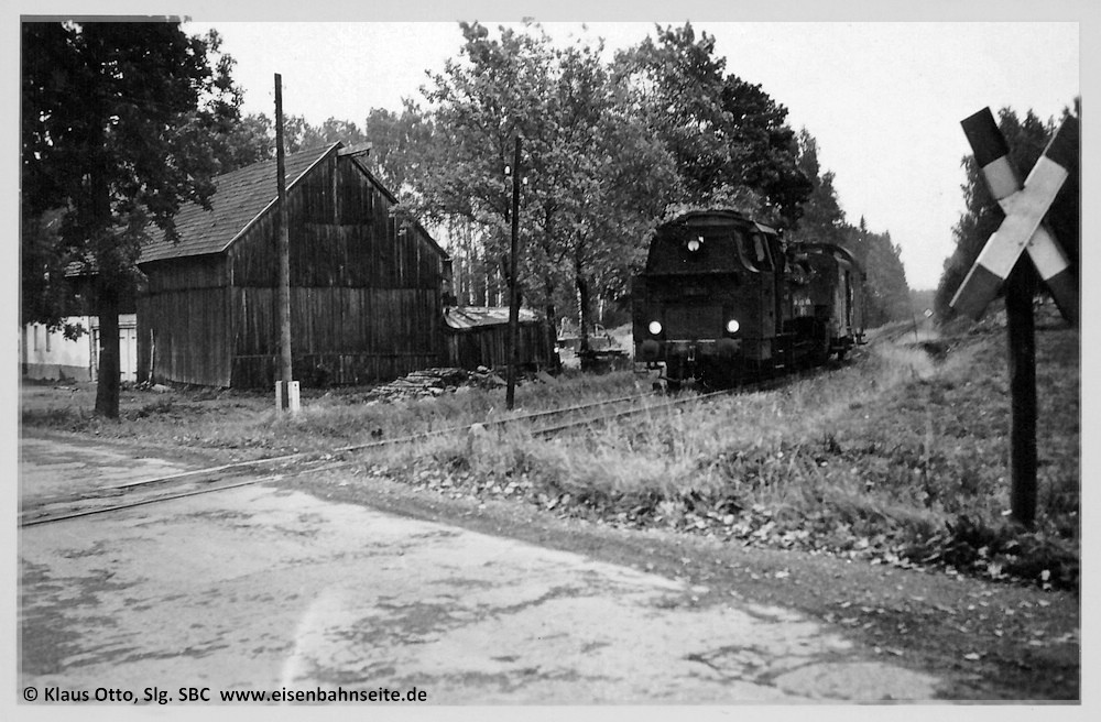 [45] 86 741 rollt aus Scheibenberg an den BÜ heran, um die letzten Güterwagen in Elterlein zu holen (24.09.1966). Günter Meyer hat bereits die Kreideanschriften am Wasserkasten angebracht, die auf das Schicksal hinweisen. Links befindet sich das Gasthaus Jägersruh.
