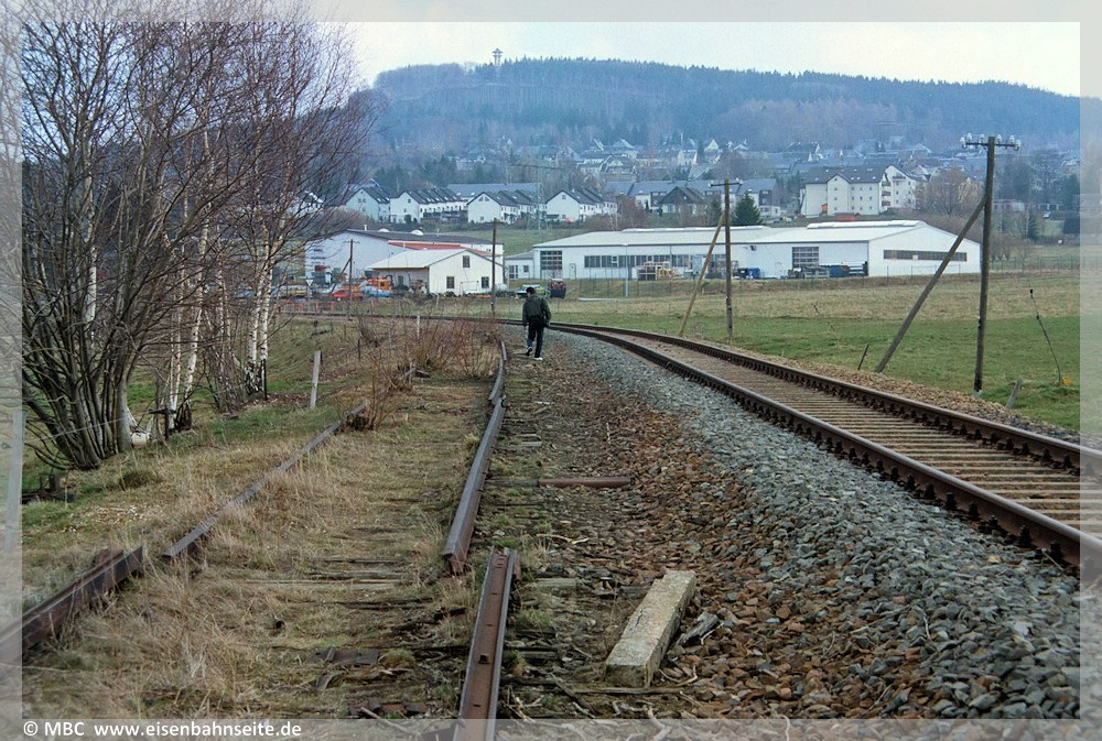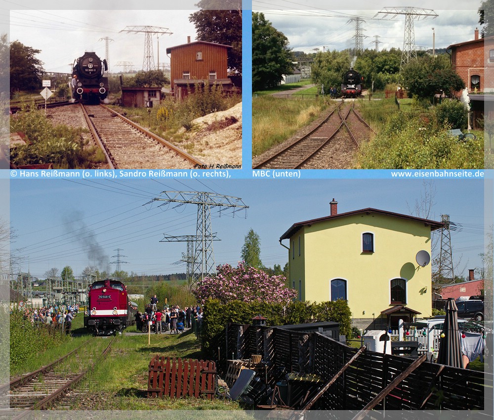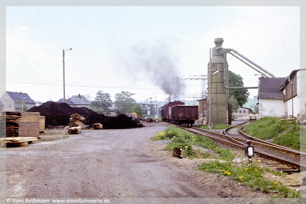 [11] Drei Bilder aus ähnlicher Position auf Posten ZS 1 und die Anschlussweiche zum Sägewerk: Oben links bedient 50 3600 als Rangierfahrt den Anschluss, 1987. Oben rechts erinnert 50 3616 am 6. August 2005 an diese Zeiten, während die Weiche zwar noch liegt, aber der Anschluss längst nicht mehr genutzt wird. Unten schließlich die Sonderfahrt am 1. Mai 2025 an dieser Stelle. Auch das Postenhaus hat sich jeweils gewandelt: Holzverschalung auf der Wetterseite, Klinker und schließlich Putz.[12] Bis 1991 erfolgten die Bedienungen beim Kisten-Walther nahezu werktäglich. Hier sehen wir 50 3694 im Mai 1987 während einer Anschlussbedienung. Links hinter dem Späneturm ist das Postenhaus erkennbar.[13] Im Anschluss existieren 2025 noch einige Gleisreste, Blick gen Zwönitz. Rechts das Gestell zeugt mutmaßlich noch von einem Späneturm. Dahinter ist wieder das Postenhaus erkennbar. Das weiße Gebäude links im Hintergrund ist die alte Schaltwarte des Umspannwerks, welche auch auf [12] erkennbar ist. Allerdings offenbart der Vergleich mit dem vorhergehenden Bild von 1987 einige Ungereimtheiten, die auf zwischenzeitliche Umbauten im Gleisbereich hindeuten (Platten verlegt bzw. anderer Standort des erneuerten Spänebunkers). Das Streckengleis verlief einst am linken Bildrand.