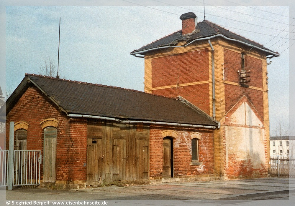 [26] Die für EG der ZS typische Klinkerfassade ist in Grünhain nachträglich verputzt worden. Der Blick entlang der früheren Ladestraße in Richtung Zwönitz.[27] Der markante Wasserturm war im März 1999 noch vorhanden. Blick von der Straßenseite.
