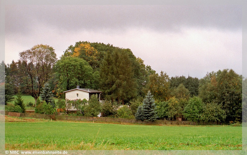 [40] Neben dem Postenhaus, das mittlerweile um die Hälfte zum Gleis hin erweitert wurde, blieb auch die Böschungsmauer aus Stampfbeton zum Schutze der Quellen bis heute erhalten.[41] Das Postenhaus im September 2000 von der gleisabgewandten Seite.[42] Gegenwärtig ist der Blick auf die Trasse an dieser Stelle wieder etwas freier, sodass der Schienenersatzverkehr von Elterlein nach Scheibenberg hier abgepasst werden konnte. Oberhalb des Büssingbusses liegt der Bf Elterlein.[43] Und noch einmal der SEV am BÜ Geyersche Straße. Nach der Jahrtausendwende ist das Postenhaus links des Fallrohres erweitert worden.