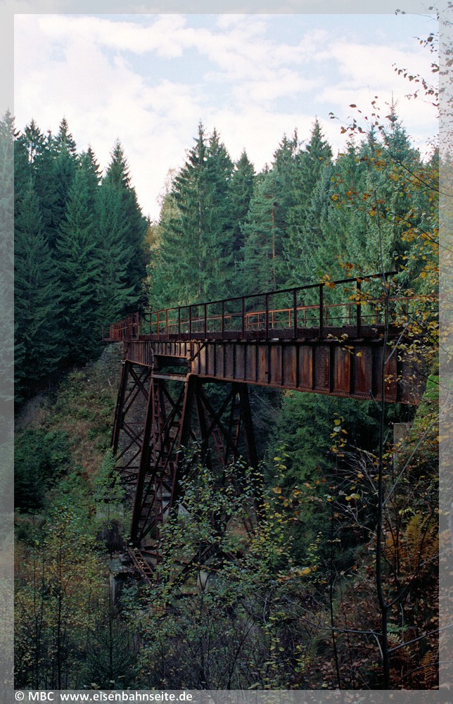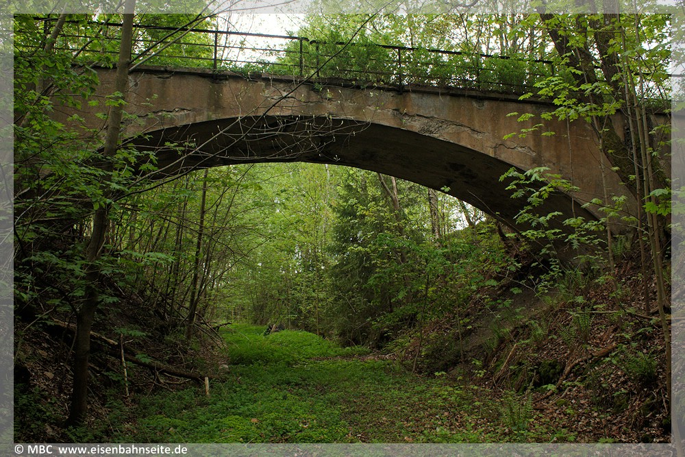 [20] Im Oktober 2000 besuchten wir erstmals die Fuchsbrunnbrücke, Blick gen Bernsbach/Scheibenberg.[21] Die Brücke blieb vom DDR-Abrisswahn zur Erfüllung des Schrottsolls mit viel Glück verschont. Das unwegsame Gelände trug sicherlich dazu bei. Dennoch reiften in den 1980ern die Pläne auch dieses Bauwerk zu vernichten. Dann kam der Mauerfall. Um den Rad- und Wanderweg aufzunehmen, müsste der Zeitzeuge umfangreich instandgesetzt werden. Die umliegenden Gemeinden befürworten dies, jedoch mangelt es an den notwendigen Finanzen.