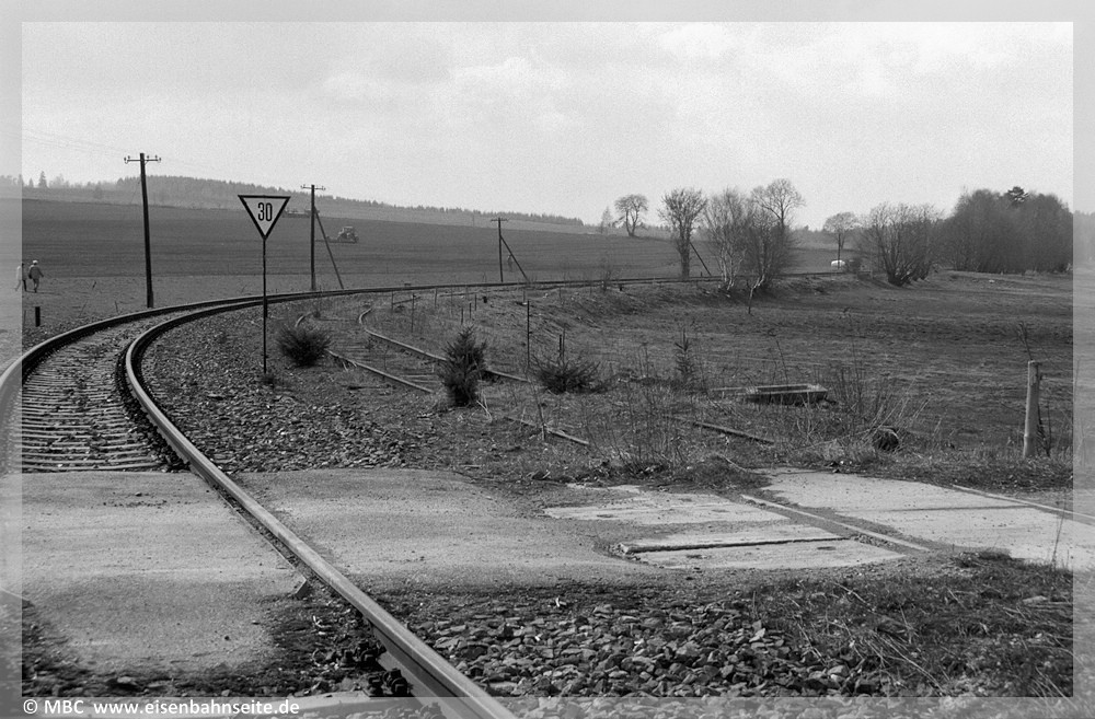 [46] Nach dem Streckenrückbau ab Elterlein, 1968, blieben vom Bf Scheibenberg her rund 500 Meter Gleis liegen. Nach 1995 erfolgte eine halbherzige Demontage des Reststückes. Selbst im April 2004 lagen die Schienenstücke noch auf den morschen Holzschwellen, die viel erlebt haben. Ob sich hier ein paar Sammler Schätze sichern konnten oder doch alles dem Wertstoffkreislauf zugeführt wurde?[47] Zwischenzeitlich waren die ZS-Gleisreste an dieser Stelle zugunsten eines Kabelkanals, der die Telegrafenleitung ersetzte, komplett verschwunden. Wer ahnte 2017 schon, dass dort bald wieder ein Gleis liegen wird? 86 1333 zieht vor der Kulisse der Scheibenberger Orgelpfeifen in Richtung Schwarzenberg.[48] Noch einmal April 2004 in Richtung Schwarzenberg/Zwönitz geblickt: Das rechts im Wegübergang liegende Gleisstück ist Mitte 2024 geborgen worden und befindet sich heute bei km 1,1 ZS in Zwönitz, siehe [17][18]. Das Feld im Hintergrund wich 2012 einer Solaranlage. Diese Anlagen dienen übrigens auch der Massenvernichtung von Wasserinsekten. Aber dem sogenannten Klimaschutz ist alles unterzuordnen – der Umwelt- und Naturschutz sowieso.