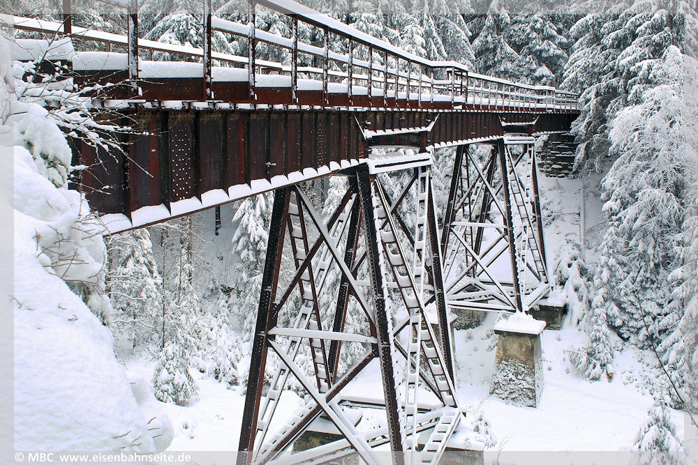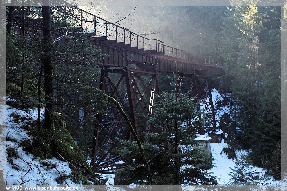 [1] Der größte Zeitzeuge der erzgebirgischen Panaromabahn – die Fuchsbrunnbrücke (oder Fuchsbrunnenbrücke, hier scheiden sich die Geister) – harrt seit dem Gleisabbau 1947 der Dinge, die da kommen.