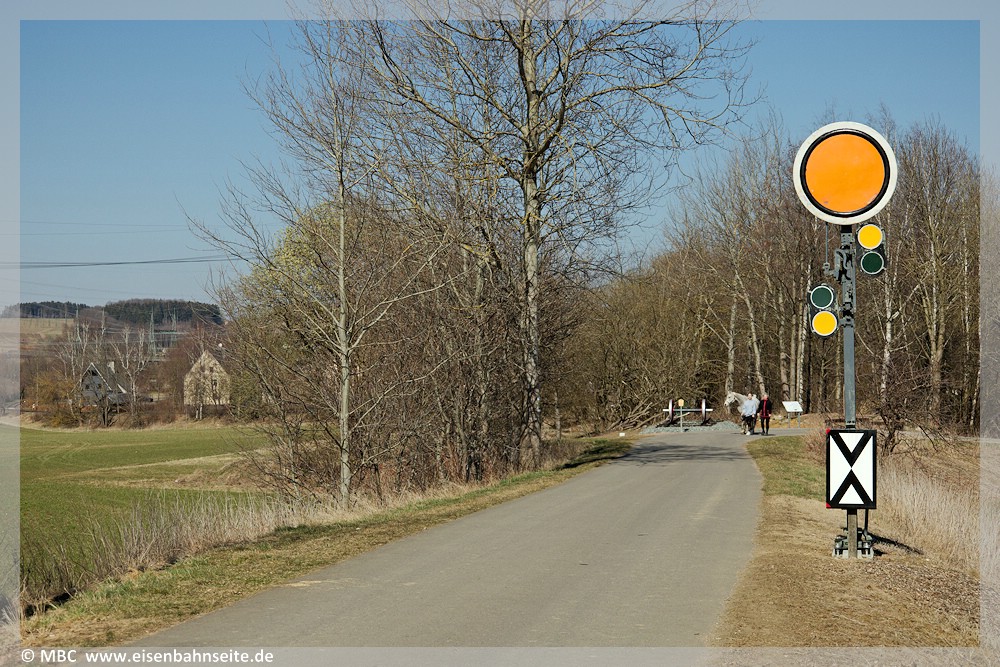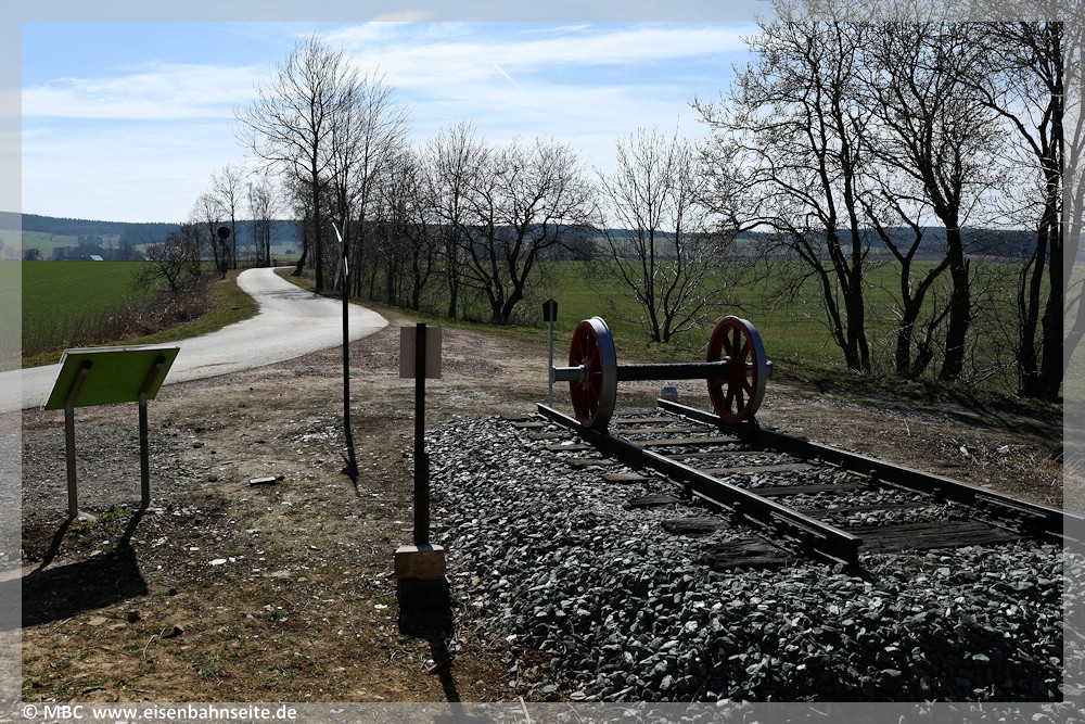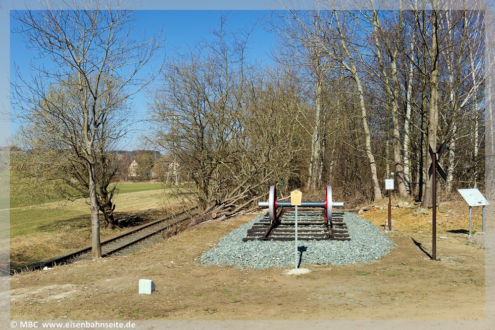 [17] Das in Scheibenberg geborgene Gleisstück, siehe [48], befindet sich seit 2024 in Lage des alten Streckengleises. Wäre der Bewuchs nicht, könnte man die Gerade bis zur Dittersdorfer Straße nachvollziehen. Links liegt das Ausziehgleis des Anschlussgleises wesentlich tiefer und endet links an einem Prellbock.[18] Mit dem Aufgleisen eines Speichenradsatzes wurde die Station 1 des Lehrpfades am 14. September 2024 im Rahmen eines kleinen Festes offiziell eröffnet. Ein in Scheibenberg geborgenes Warnkreuz, ein angepasster Hektometerstein, eine Infotafel sowie eine Sitzgruppe komplettieren das Ensemble. Aus dieser Perspektive ist die Einmündung des Rad- und Wanderweges auf die Bahntrasse in Richtung Fuchsbrunnbrücke gut nachvollziehbar. Ein interessantes Detail: Das Scheibenberger Gleisstück besteht aus drei verschiedenen Schienenprofilen! Verbaut sind die sächs. Form Va, in der Mitte sächs. Form VI und S 49.[19] Wenige Meter weiter befindet sich am km 1,154 ZS seit 6. April 2024 wieder ein Formvorsignal. Es steht an der Stelle des zirka 1950 demontierten Einfahrvorsignals Vt des Bf Zwönitz, welches das Einfahrsignal T ankündigte.