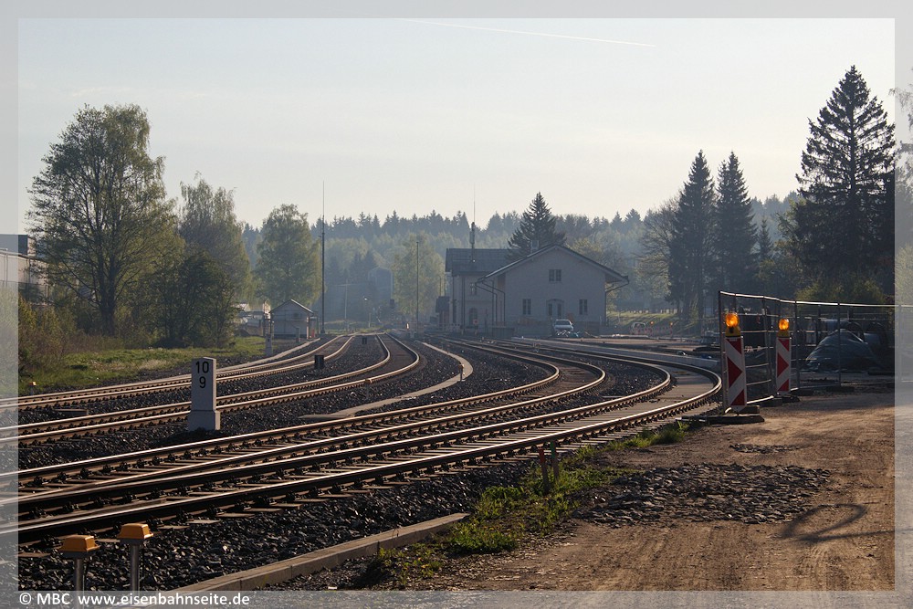 [49] Man könnte meinen, der Bahnhof Scheibenberg ist wieder auferstanden. Rein betrieblich trügt die Optik, denn es handelt sich um ein reines Testgelände. Blick in Richtung Schlettau, wo die meisten Züge nach Stollberg, Zwönitz oder Elterlein ihren Anfang nahmen.