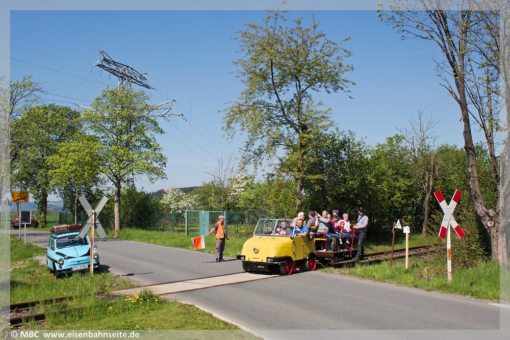 [51] Bis auf den letzten Meter nutzte der Sonderzug das Ausziehgleis, um die Fahrgäste zum Festgelände zu transportieren. Der Eindruck täuscht, denn selten war diese Stelle nicht von Besuchern umlagert.[52] Das Gleiskraftrad des VSE pendelte zwischen Umspannwerk und Bf Zwönitz via Spitzkehre.