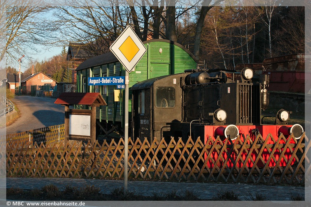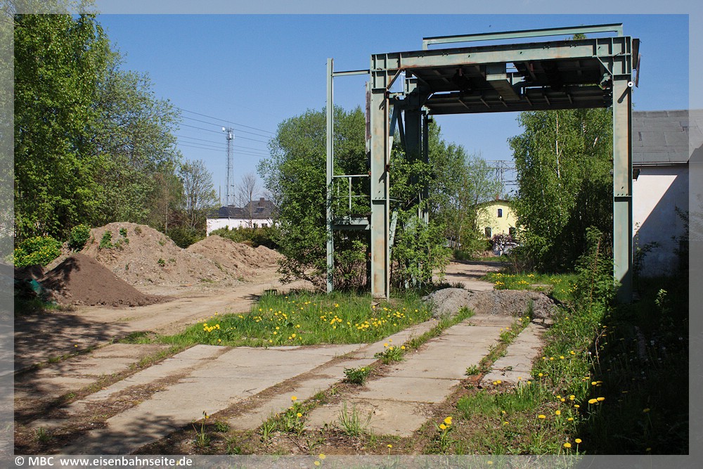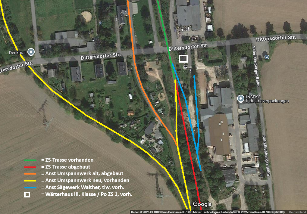 [14] Die Grafik macht deutlich, welch ein Sammelsurium an Anschlüssen und Streckenresten auf engstem Raum an der Dittersdorfer Straße bestand bzw. noch Bestand hat. Der blau eingezeichnete Anschluss „Kisten-Walther“ könnte unvollständig bzw. unpräzise sein, da ich mich nur an den Gleisresten orientiert habe.[15] In Höhe der Lokomotive befand sich bis ca. 2006 die Spitzkehrenweiche des ersten Anschlusses von 1929, siehe orange Linie bei [14]. Der Abzweig beschrieb einen leichten Linksbogen und führte dann in einer Gerade niveaugleich über die Dittersdorfer Straße.
