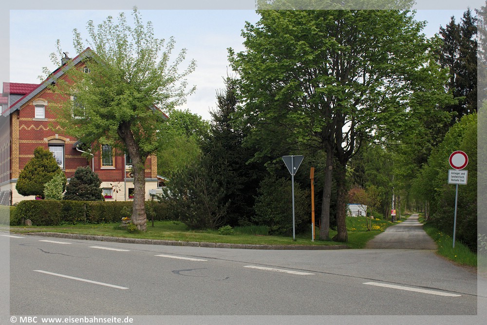 [37] Der BÜ Zwönitzer Straße im Mai 2025, rechts die ZS-Trasse gen Scheibenberg. Laut Hahn 2025, S.73 liegt das Gleis noch immer unter dem Straßenbelag begraben. Bei einer Kanalverlegung musste ein Stück davon abgetrennt werden. Ein Anwohner berichtete mir, dass der Trennschleifer den (überraschenden?) Kontakt mit den Schienen nicht heil überstanden habe. In Bildmitte stand das Einfahrsignal des Bf Elterlein.
