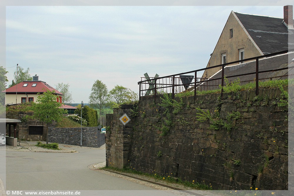 [36] Die beiden Widerlager der EÜ Bahnhofstraße (heute Bahnstraße) in Richtung Scheibenberg geblickt. Auf der Stützmauer befand sich die Einfahrweiche des Bf Elterlein. In Höhe des linken Bäumchens befand sich ein Brückenpfeiler, denn dem großen Eisenträger über die Straßenkreuzung folgte noch ein kleiner. Das Gebäude links im Hintergrund ist ein, 1898 von der Staatsbahn gekauftes, zur Bm ZS II umfunktioniertes Wohnhaus. Hier sparte man sich auf diese Weise den Neubau eines Bahngebäudes. Es beherbergte auch den Wärterposten 6. Das Meyer-Vergleichsbild von 1967 findet sich in: Schlegel 1992, S.158f. oder Schlegel 2025, S.67u.r.