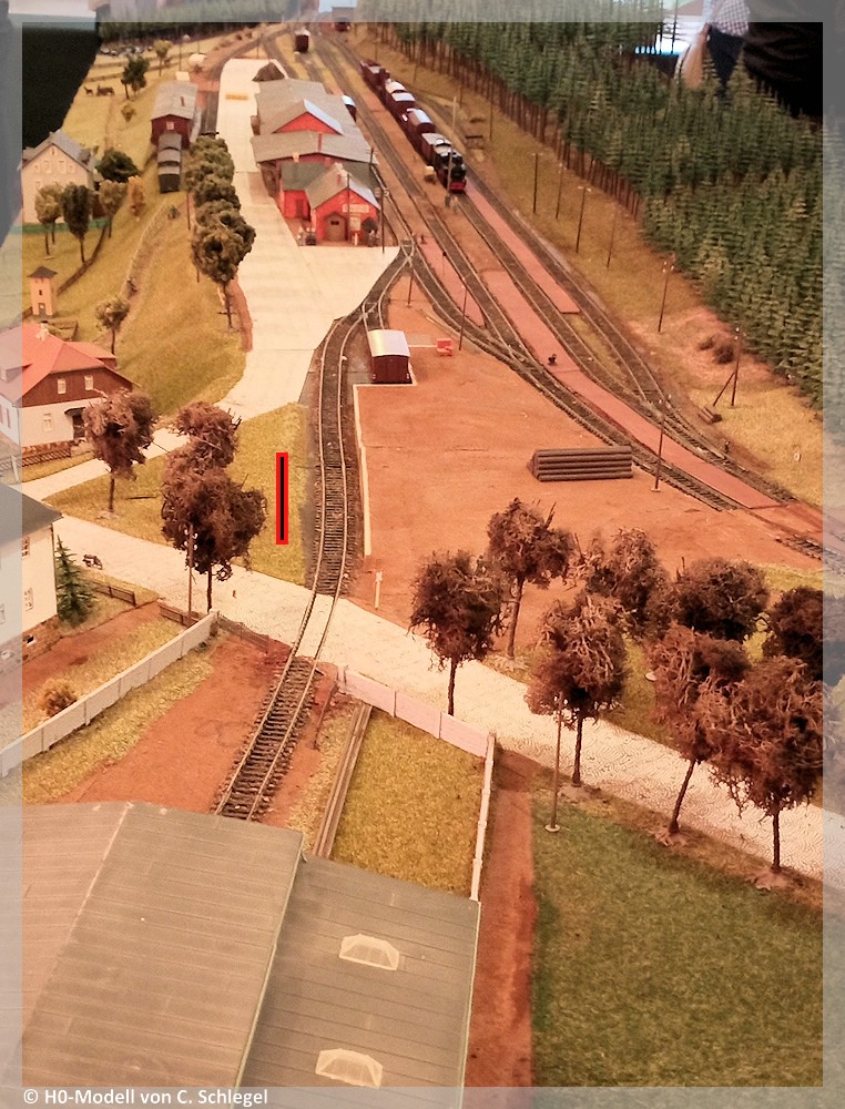 [24] Seit Juli 2005 erinnert die 1957 von der DR übernommene Köf 5753 an die Eisenbahnzeit in Beierfeld. Ein Bahndienstwagen kam wenig später dazu. Links im Hintergrund sind die Ladestraße und das Bahnhofsgebäude zu sehen.[25] Das zu den Jubiläumsfeierlichkeiten im Elterleiner Güterboden ausgestellte H0-Modell macht den Bf Beierfeld erlebbar. Blick vom Gleisanschluss der 1928 errichteten Halle, die als Blechlager von Otto Wolf bzw. Thyssen diente. Ganz im Hintergrund am Bahnhofskopf in Richtung Bernsbach ist rechts der Kleinlokschuppen erkennbar. Ab Oktober 1934 war hier eine Kleindiesellok (Kö) des Bw Aue stationiert, die das umfangreiche Rangiergeschäft und Übergaben zu Nachbarstationen übernahm. Obwohl es betrieblich die bedeutendste Zwischenstation der ZS war, hat der Bf nie ein repräsentatives EG, sondern nur ein kleines Dienstgebäude erhalten. Die verschiedenen GS-Anbauten unterstreichen den sparsamen, stückwerkhaften Charakter. Die rote Markierung offenbart den heutigen Standort der beiden Denkmalfahrzeuge, siehe [24]. Auch die benachbarte Kopf- und Seitenrampe existiert noch.