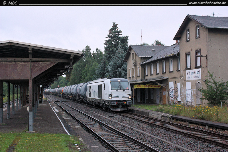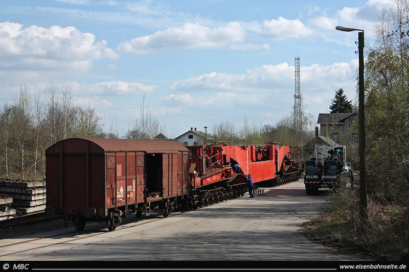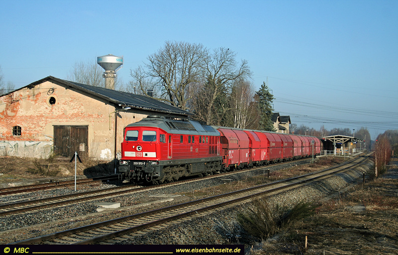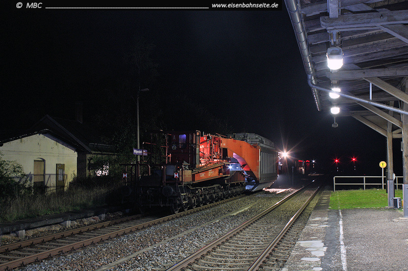 Zwischen 2014 und 2017 erreichten mehrere Trafotransporte den oberen Bahnhof, um dann per Straße zum ZUW Löbenhain (Röhrsdorf) zu gelangen. Aufgrund der Lademaßüberschreitung verkehrten die Transporte zumeist während der Nachtruhe. Am noch jungen Morgen des 22.10.2016 hat 232 587 gerade mit einem Schwertransport „Wio“ erreicht. Das links sichtbare Wirtschaftsgebäude stammt von 1872.