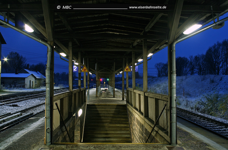 … seit 2010 ist der Tunnel gesperrt bzw. mittlerweile verfüllt worden. Wie im 19. Jahrhundert passieren die Reisenden nun wieder niveaugleich die Gleise 1 und 2. Ein Sicherungsposten sperrte den Überweg bei Fahrten in Richtung Küchwald/Hartmannsdorf ab, und sorgte im ansonsten unbesetzten Bahnhof noch für etwas „Leben“. Dieses Provisorium endete nun zum 15. Dezember 2017.