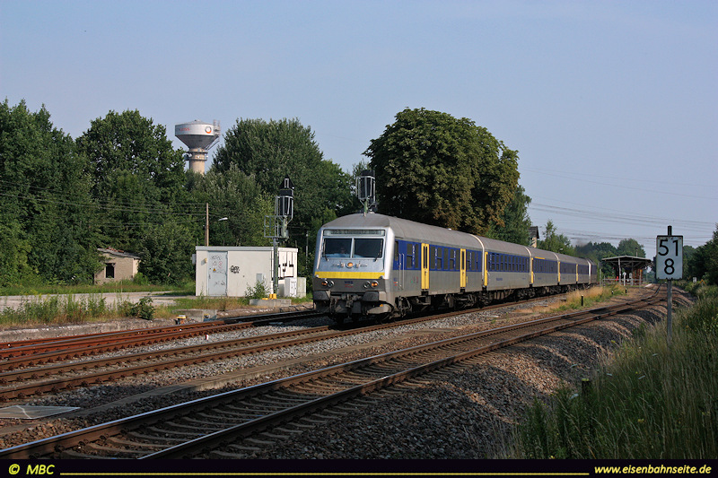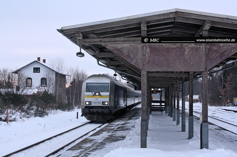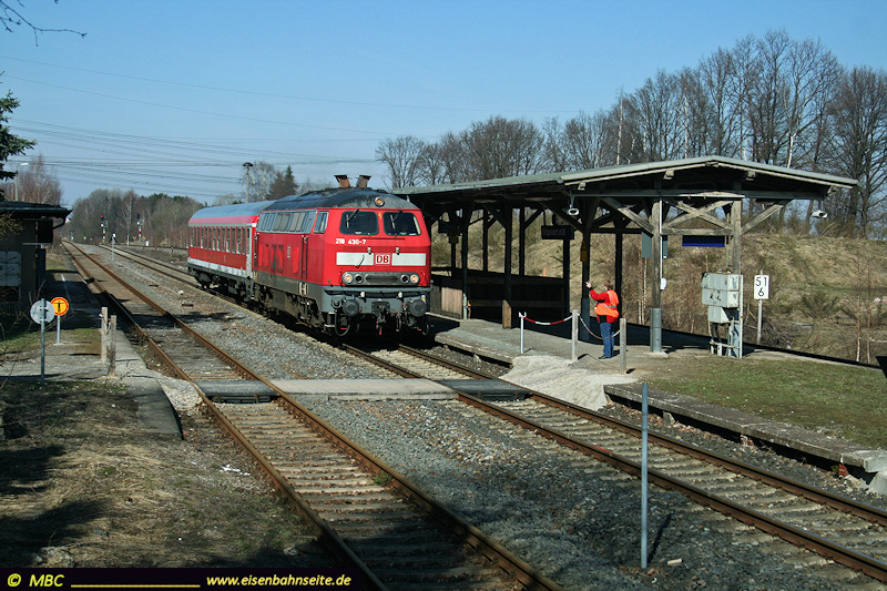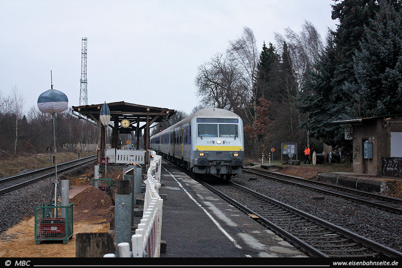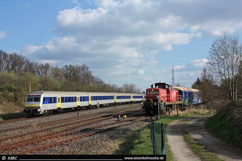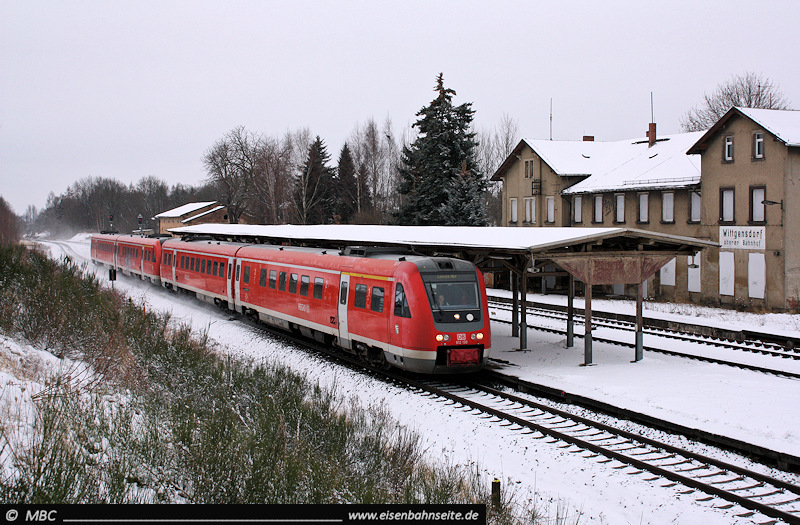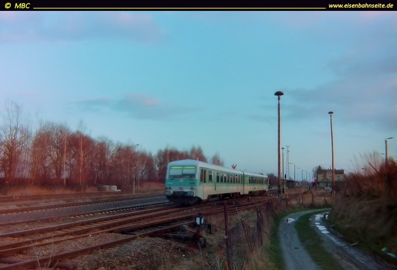 An Stelle der 2005 entfernten Nebengleise wurde ein Erdwall aufgeschüttet. Dieser diente gern als Fotostandpunkt, ist aber mittlerweile stark von der Natur vereinnahmt worden. 612 130 und 612 106 swingen nach Leipzig durch (1/2012).