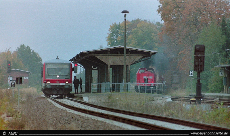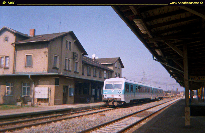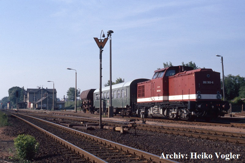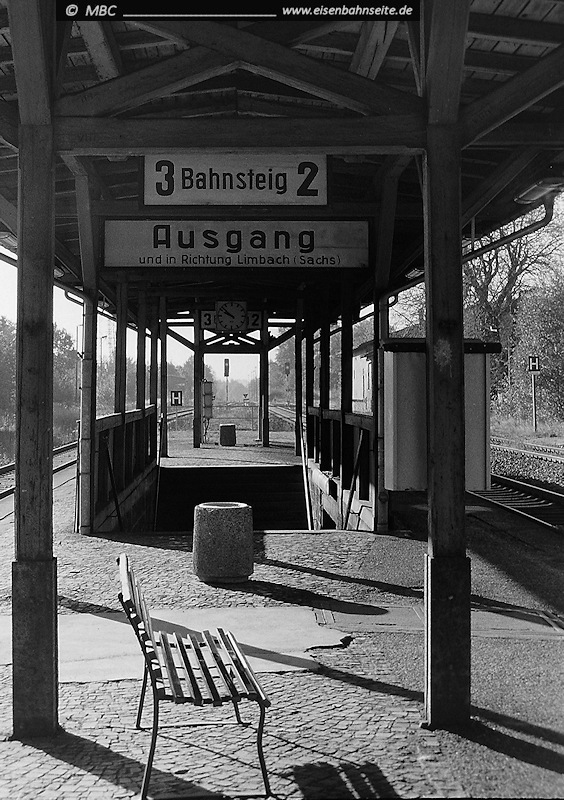 1994 hielt 202 383 mit einem kurzen Limbacher Gmp Vormittagsruhe auf einem der beiden nördlichen Stumpfgleise. Ebenfalls zu sehen sind die 2005 zurückgebauten Weichenverbindungen. Der bis November 2017 noch auf ganzer Länge vorhandene Hausbahnsteig bietet mittlerweile Fläche für ein Birkenwäldchen.