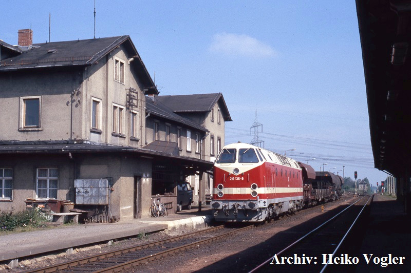 219 136 fährt mit einem Nahgüterzug aus Limbach (Sachs) am Hausbahnsteig ein (1994). Unter dem 1899 errichteten, noch mit Oberlicht ausgestatteten, Vordach ist ein VW-Kleinbus erkennbar.