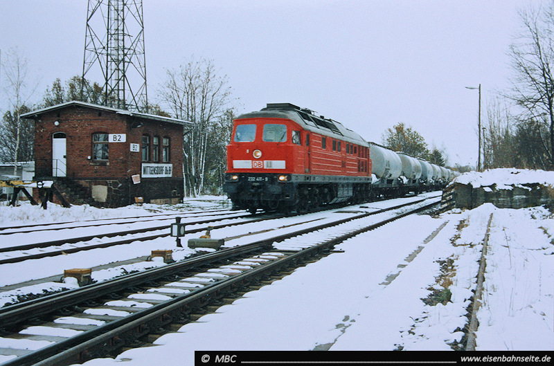 Das Befehlstellwerk 2 wird von einem „Leerkalk“ nach Blankenburg/Harz, gezogen von 232 411, passiert (11/2004). Diese „Stellerei“ entstand 1895 und erfüllte 110 Jahre lang ihren Zweck. Rechts ist Gleis 1a mit der Kopf- und Seitenladerampe zu sehen.