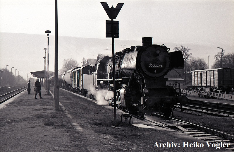 Als an einem Wintermorgen Mitte der 1980er-Jahre die Altbau-50 2740 in „Wio“ mit einem Nahgüterzug angekommen war, existierte der Mittelbahnsteig noch auf ganzer Länge. Bis zum Umbau 2005 war von Gleis 2 auch eine Fahrstraße nach Limbach möglich. Im Zugverband sind Gaskesselwagen eingereiht, wie sie noch bis Ende 2023 nach Hartmannsdorf verkehrten. Noch ist der Bahnhof mit Formsignalen ausgestattet.