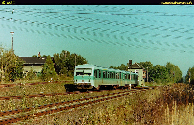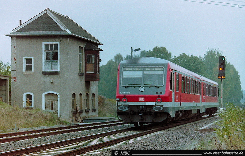 Betrachten wir zum Abschluss noch das W1 aus der Nähe. Es hatte eine reine Zustimmungsfunktion (abgesehen von Rangiersignalen). 628 592 fährt am 20.10.2003 in Richung Leipzig aus. Nach wie vor wird die Strecke hier eingleisig.