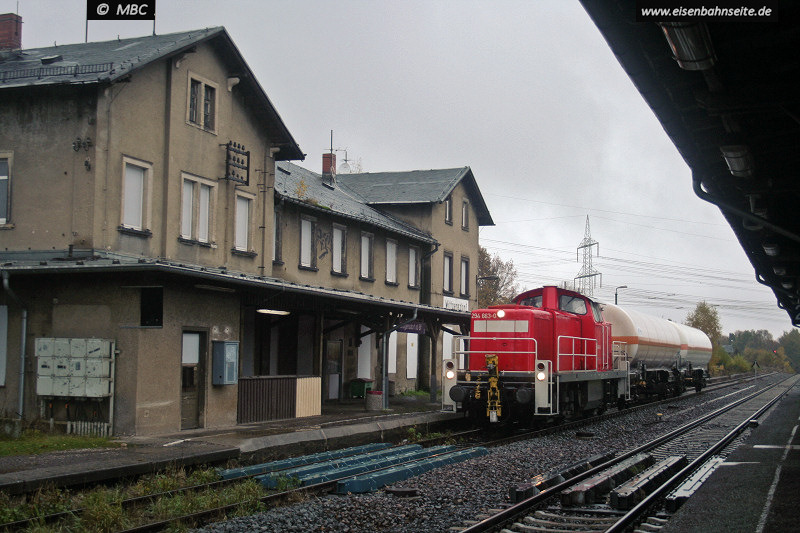 Verlassen und zugenagelt präsentiert sich das Gebäude im Oktober 2008. Im Erdgeschoss befanden sich einst u.a. nach Klassen getrennte Wartesäle und ein Bahnhofsrestaurant. Eine Übergabe mit Gaskesselwagen aus Hartmannsdorf rollt ein. Die Verstärkungen am Gleis verraten die Lage der damals 100 Jahre alten Fußgängerunterführung. Dies sollte sich aber bald erledigen, denn …
