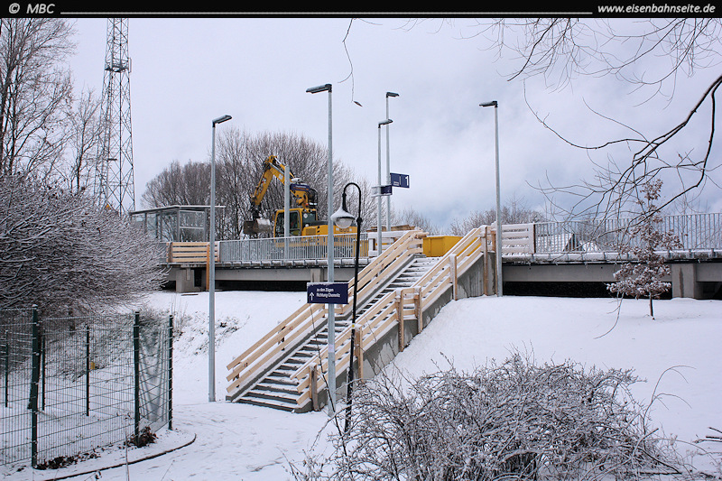Am 15.12.2017 um 13:00 Uhr ging der neue Haltepunkt an der Oberen Haupstraße offiziell in Betrieb. In den ersten drei Tagen war zunächst nur der Außenbahnsteig am Streckengleis in Richtung Küchwald in Betrieb. Beide Bahnsteige sind nur über lange Treppen zugänglich. In Zeiten vielgepriesener „Barrierefreiheit“ sicherlich nicht der Weisheit letzter Schluss.