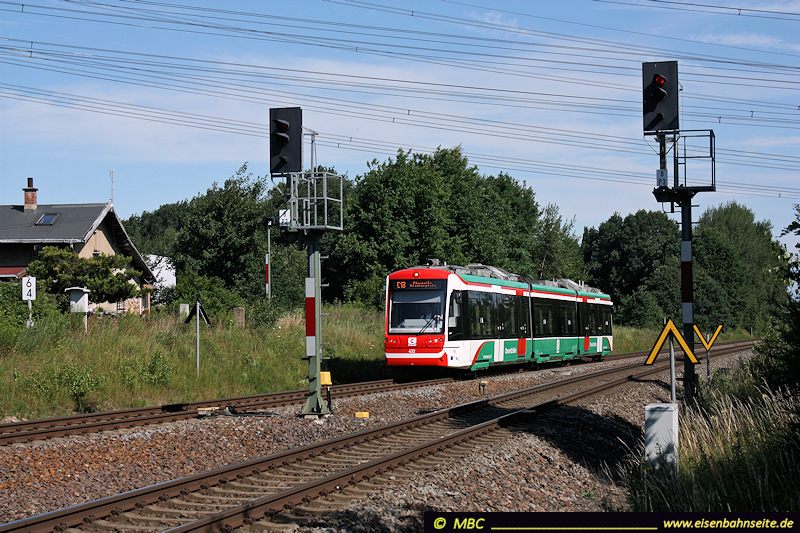 Die nahezu selbe Stelle im Juli 2017: Die Ausfahrsignale gen Burgstädt sind nach vorn gewandert. Das W1 wurde 2005 abgerissen, während das Wärterhaus an der LW noch bewohnt ist. Rechts davon ist das Rangiersignal nach Hartmannsdorf zu sehen. Hybridwagen vom Typ „Citylink“ sind jetzt für den Nahverkehr zwischen Burgstädt und Chemnitzer Innenstadt zuständig.